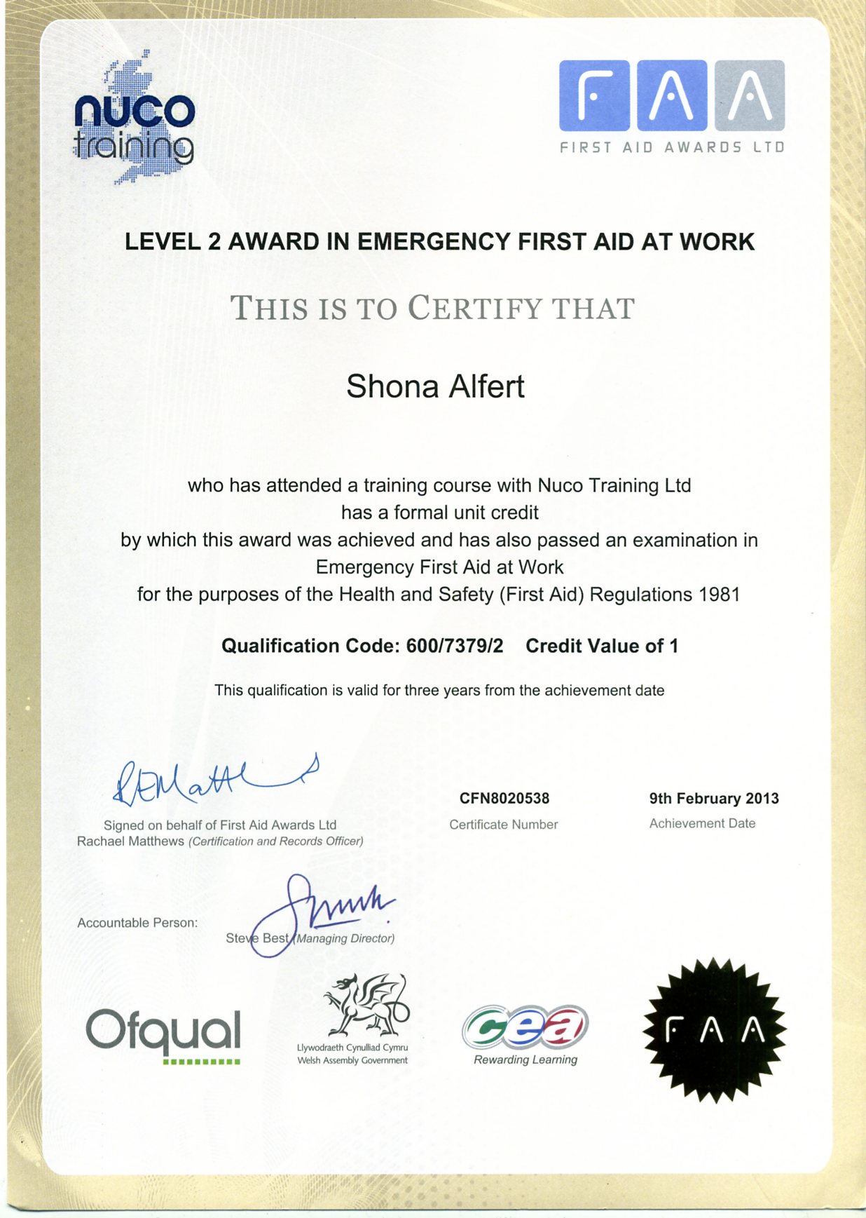 First Aid Certificates gained at St. Albans February 2013