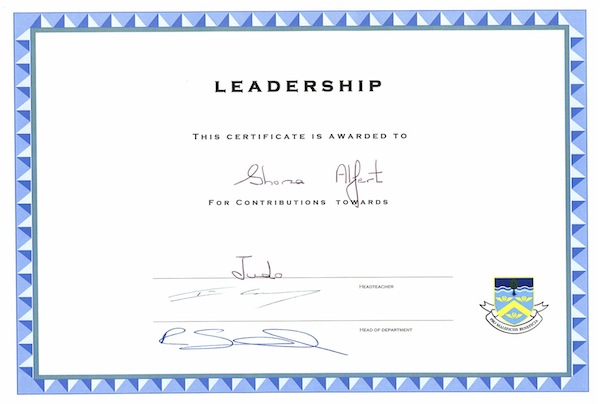 Leadership Certificate from Dr. Challoners High School awarded to Shona Alfert