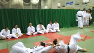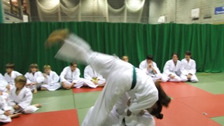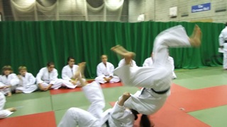 It is important to note the correct placement of the 'stomach' foot and althougn you can not see if properly here, that the supporting foot is placed inbetween Uki's legs and not in front of it. Failure to observe this will result in Uki falling on top of Tori rather than going over as the Kuzushi will be incorrect. It should also be noted that the 'stomach' foot acts as a pivot and Uki is guided over Tori through the use of the arms. If the 'stomach foot' is used to try and propel Uki into the air they will not land correctly reducing the chance of an Ippon.