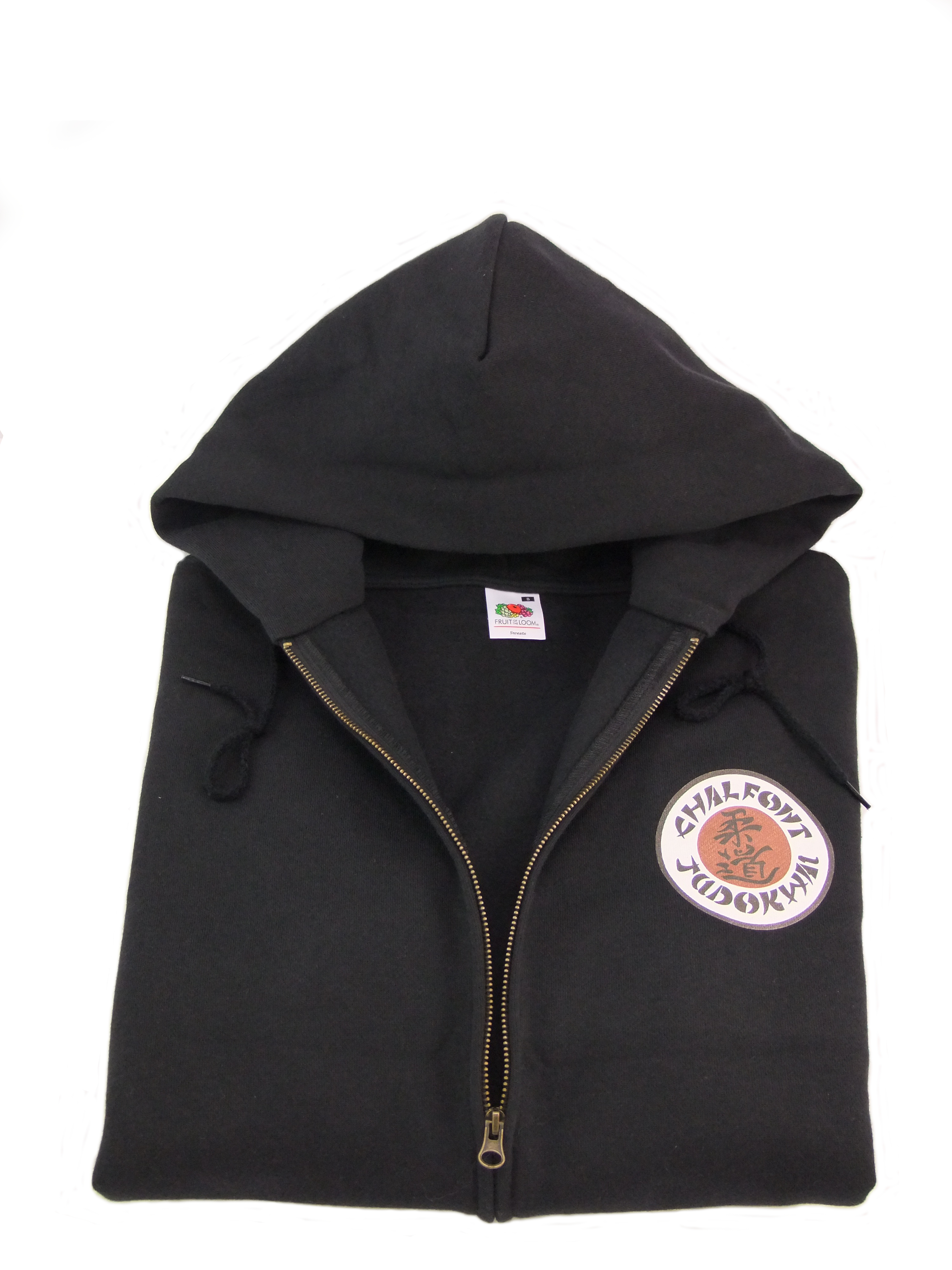 Black sweat shirts, hoodies and zipped hoodies. Large Chalfont Judokwai badge on left side with the hoodies featuring deep hand warming pockets.
